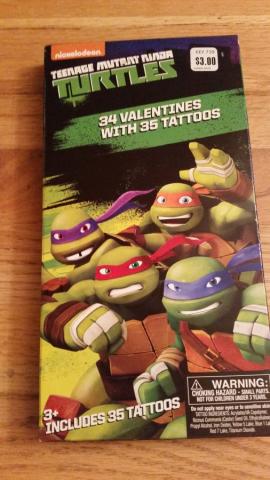 First in this batch of items is the Paper Magic Group Teenage Mutant Ninja Turtles 34 Valentines with 35 Tattoos. These are images of the Nickelodeon TMNT, as one would see them before Season 4, without any space gear. There’s a total of seven designs. Three group shots of the four Turtles, plus a design for each Turtle. Most of these images I have seen before. My favorite is a Video game shot, with all four Turtles. It says “In the Valentine Game”. With enough Tattoos to give with each card, and one to keep for the one giving out the cards.