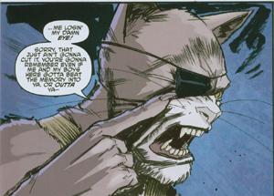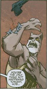 The fight is now at full swing with the other Turtles jumping in. Old Hob is angry as he starts to remove the throwing stars from his arm. Raph stands confused by three more of his kind. He’s still not fully sure on who he is and this is a lot to take in. Old Hob uses this chance to attack him, though Raph is able to handle himself going into a hand to hand fight with Old Hob. The fight is dirty as Raph is not a trained Ninja at this point, he’s fighting the best he can, even getting a chance to bite down on Hob’s bad arm. While the others are still fighting thugs, Raph takes the lead, swearing he’s going to kill Hob. Though just as he’s going in to really nail on the passed out cat, Leonardo stops him.