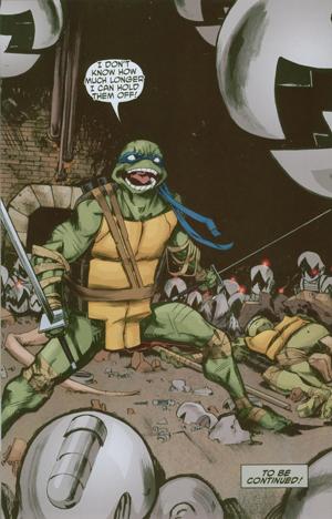 Though, Raph and Mike though are not so sure of what’s going on around them, as they show up to find a mess. They hear Leo call out, as they drop the food, rip of their clothes (some how the Turtles always can do that fast) and race in to help Leo. The last page is Leo standing alone, beaten screaming for help as Don and Splinter are down. Mousers surrounding Leonardo.