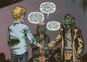 The next few pages are of Michaelangelo and Raphael picking up dinner. Michaelangelo is introducing Raph to his friend, a man who doesn’t seem to have problems with giving pizza to Mutant Turtles. Mike shares the story of how they met Woody. When Woody comes out and says hi, you see that they’re friends and he even knew about the search that the brothers were doing for Raph. They get their pizza as Woody has to return to work.