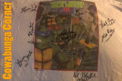 While talking with these two new friends, Miki disappeared with Nicki and the others for a little bit. Around this time a friend from Detroit Fanfare showed up, Steven. I started to talk with Steven, as he told me about his Casey Jones costume he was going to wear on Sunday. I had some of the autographed cards that we give away on our contests here, and gave him a few. To my surprise he gave me enough cash to get one more item signed by Brian. Miki returned to where I was. So once we went our own ways, Miki and I went straight to Brian’s booth where I got my TMNT III Production team shirt signed.