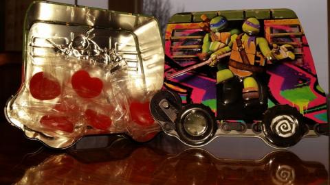 What caught my attention about this is the only thing that says Valentine on it is the sticker on the wrapper. This little tin does not have to just sit out for the Holiday, but can be used all year long to keep things safe and look cool! With all four Turtles as a part of the tin, the shell raiser, and an easy to close and open lid this little item became a must have as soon as I saw it. I do have a weakness for tin TMNT items, I usually really like the designs and can always find stuff to store inside of them.