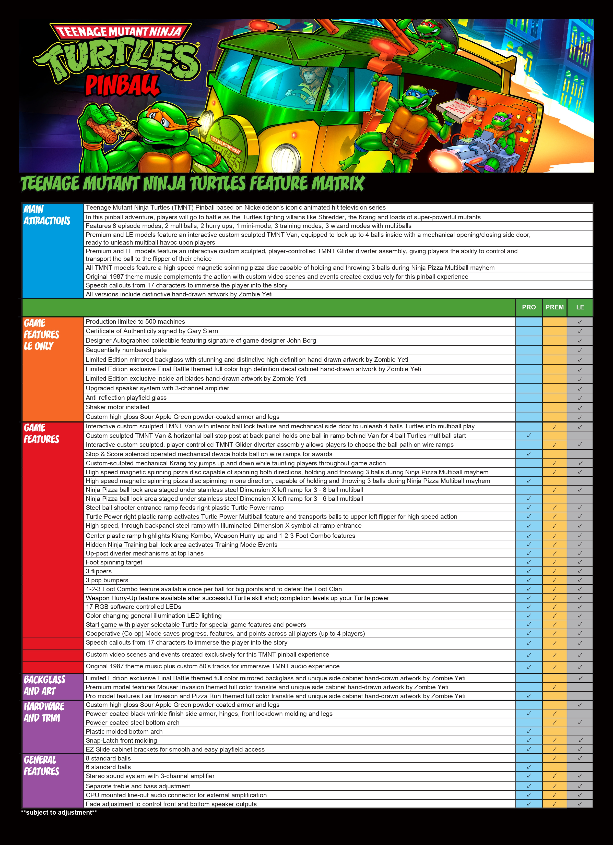 There are three different versions of this game. Each of which has their own artwork that stands out next to each other. My favorite of the three goes to the ooze green frame of the Limited Edition Model with the smashing Turtle Van art work on the side of the machine. The art is done by Zombie Yeti, who is no stranger to doing art for awesome Pinball Machines as he’s designed for a few other machines by Stern’s including Deadpool. And how fitting is it that Zombie Yeti also enriched the Ghostbusters Pinball Machine with his talents. His artwork is bold and flashy, and brings in the feel of our classic fun loving Turtles. He did the artwork for all three of the cabinets coming out and I just love how well they look next to each other. If I had the space and money this would be a collectors dream set of games.
