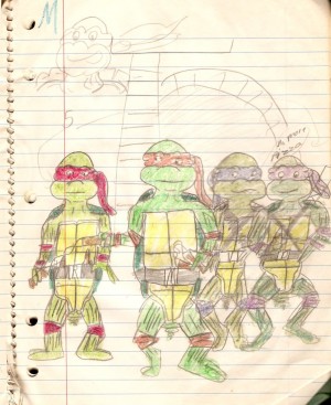 My early drawings of the Turtles were so skinny that they were close to being stick figures; no muscles in the arms or legs, just lines drawn there to show that they have muscles. These drawings were done in fifth and sixth grade. Though my sixth grade teacher loved these drawings and would have me do huge poster size drawings for his son, which was later hanging on the walls of his son's room. He did make me feel proud of my art. Yet, I still compared myself to my family and felt my art was not good enough to send in to comics or magazines. I wanted to get better.